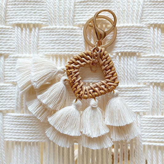 Creative Boho Silicone Beads Macrame Tassel Keychain Custom Natural Rattan Metal Holder Bag Pendant Charm Keychain